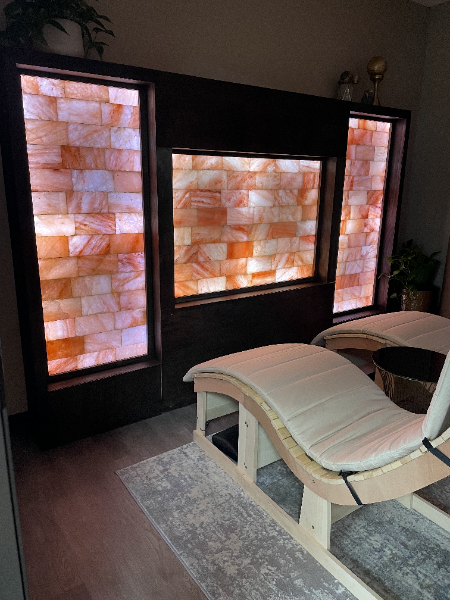 Relax in the glow of the Salt Room where ions from heated salt blocks promote respiratory health, skin rejuvenation and overall relaxation. Ions have natural anti-bacterial and anti-inflammatory properties and help by opening airways allowing more oxygen to move through the body. Breathing issues like asthma, bronchitis, sinusitis and children’s ear infection are known to improve. Salt Therapy dates to Ancient Greek & Roman times where salt caves were often used.